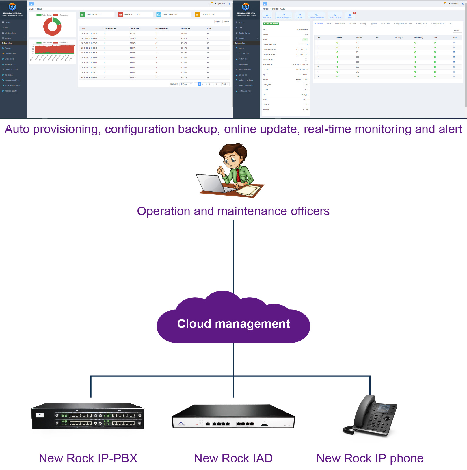 On the Internet, the cloud service can help customers to gain direct access to New Rock devices in private network, including OM series IP-PBX, MX series VoIP gateway, and IP phone, allowing remote maintenance and management of New Rock devices. This cloud service is particularly suitable to large-scale installation, configuration, and maintenance and operation.