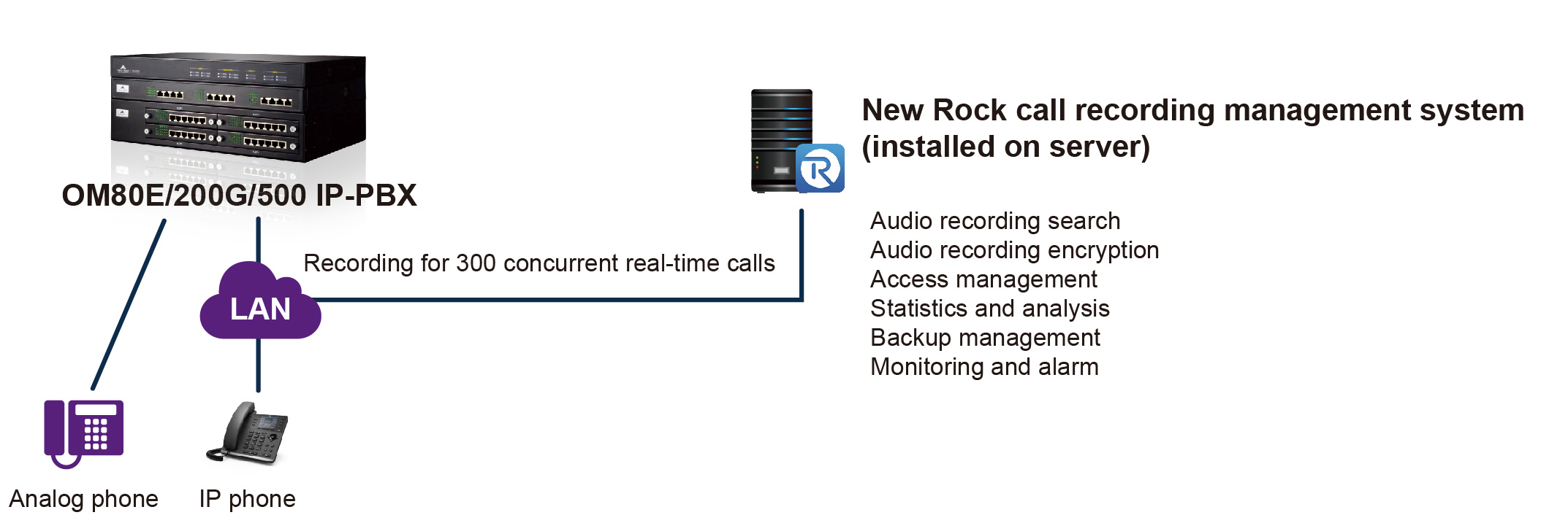 1.Distributed recording and centralized management: small OM IP-PBXs at branch offices, with built-in storage for call recording; medium to large OM IP-PBXs and New Rock recording management system at the headquarters for centralized management of call recordings at the headquarters and branch offices;