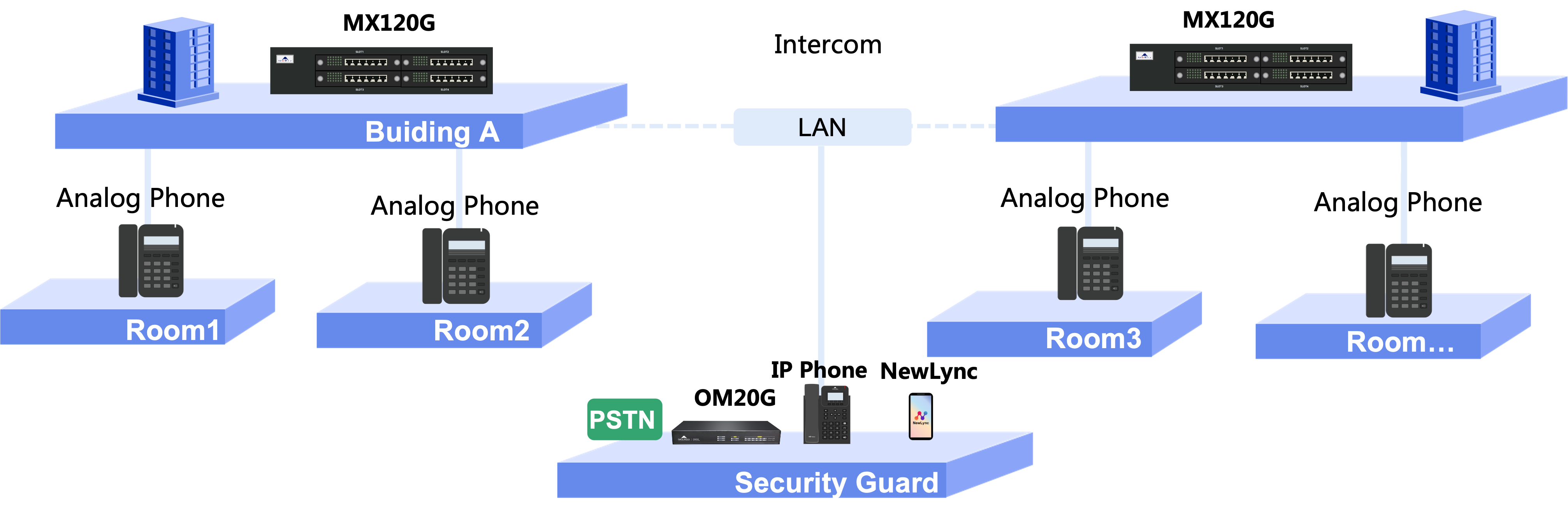 1.Deploy MX120G in each building for intercom and connect to the Security Guard office by Lan. no need for more PBX systems. FXS ports of MX120G can support free internal calls with all extensions.Multi-site networking