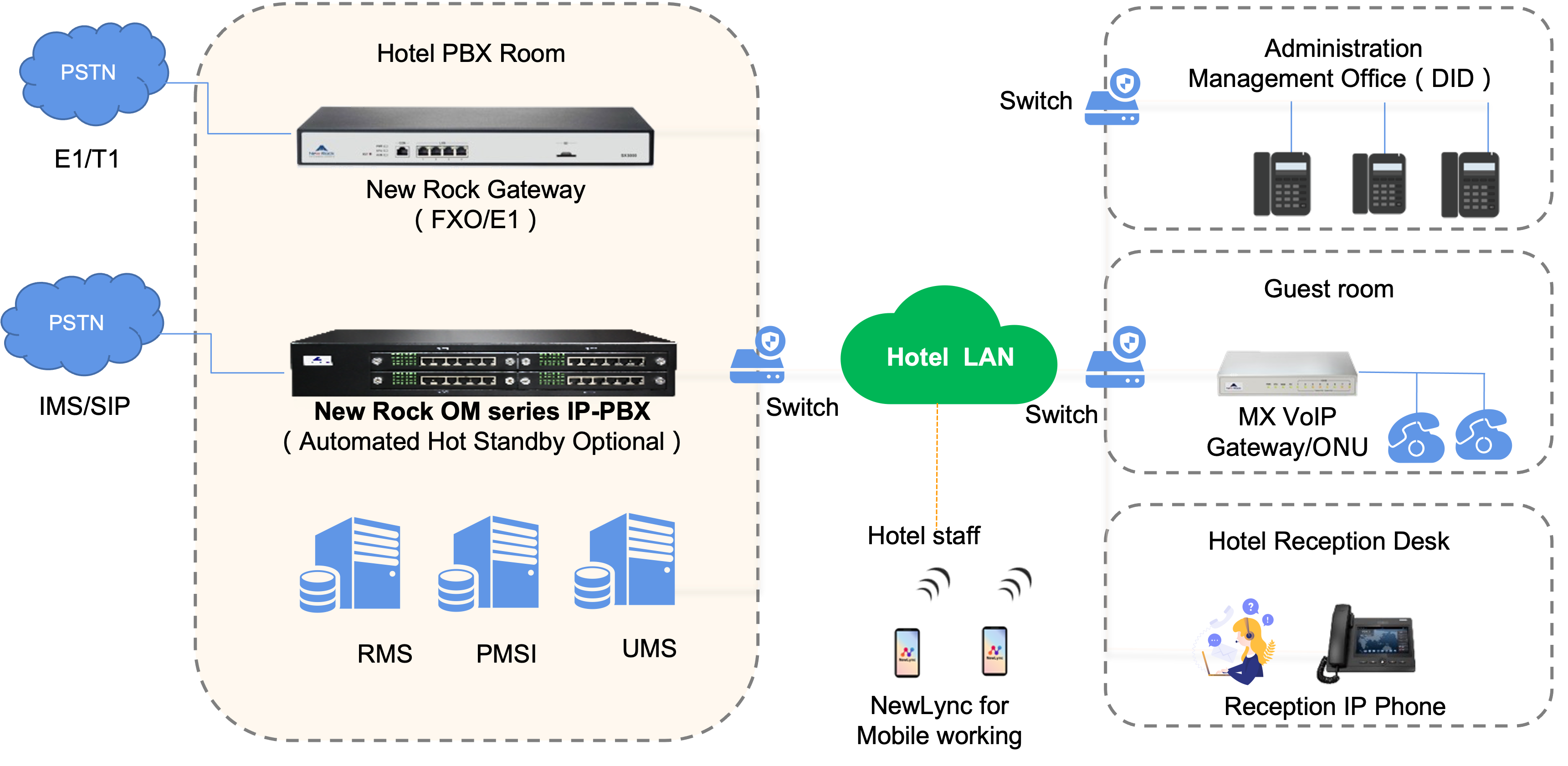 -ONU registers to New Rock OM IP-PBX through the hotel LAN and connects to the analog telephone to allow the room phone perfectly functioned.