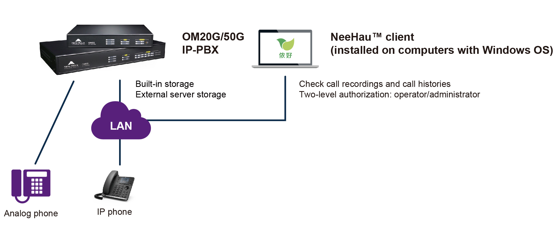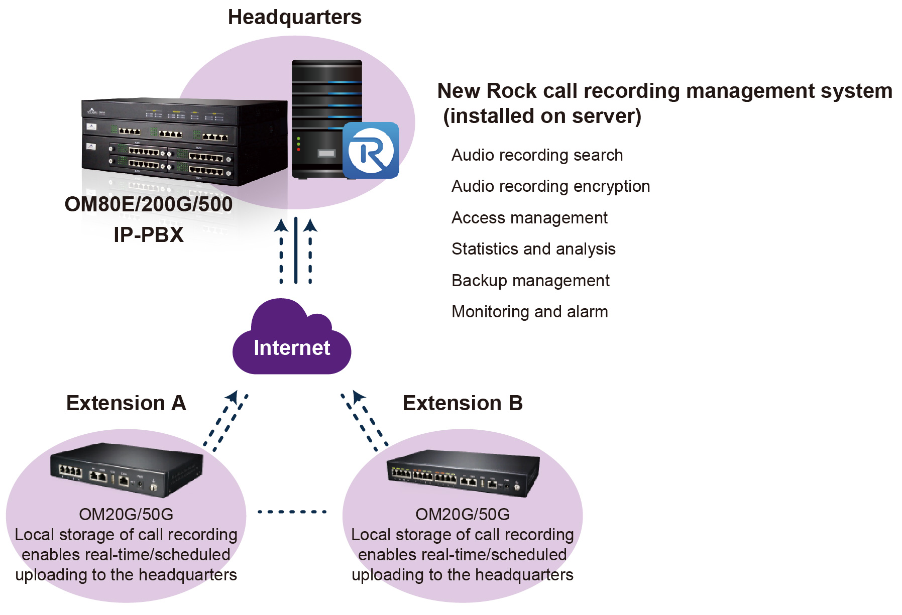 Small OM IP-PBXs at branch offices, with built-in storage for call recording; medium to large OM IP-PBXs and New Rock recording management system at the headquarters for centralized management of call recordings at the headquarters and branch offices;