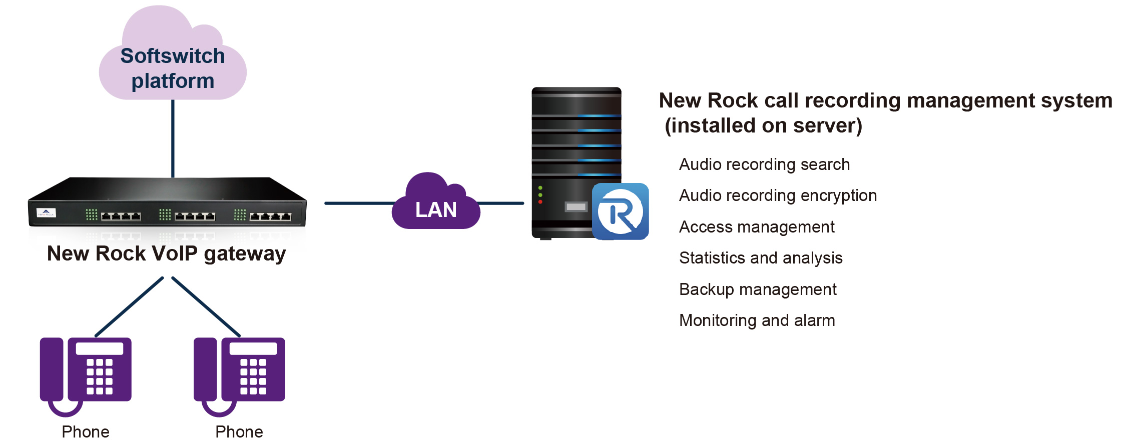 All calls through the VoIP gateway are automatically recorded and stored on the server, which can be centrally managed by the New Rock recording management system.