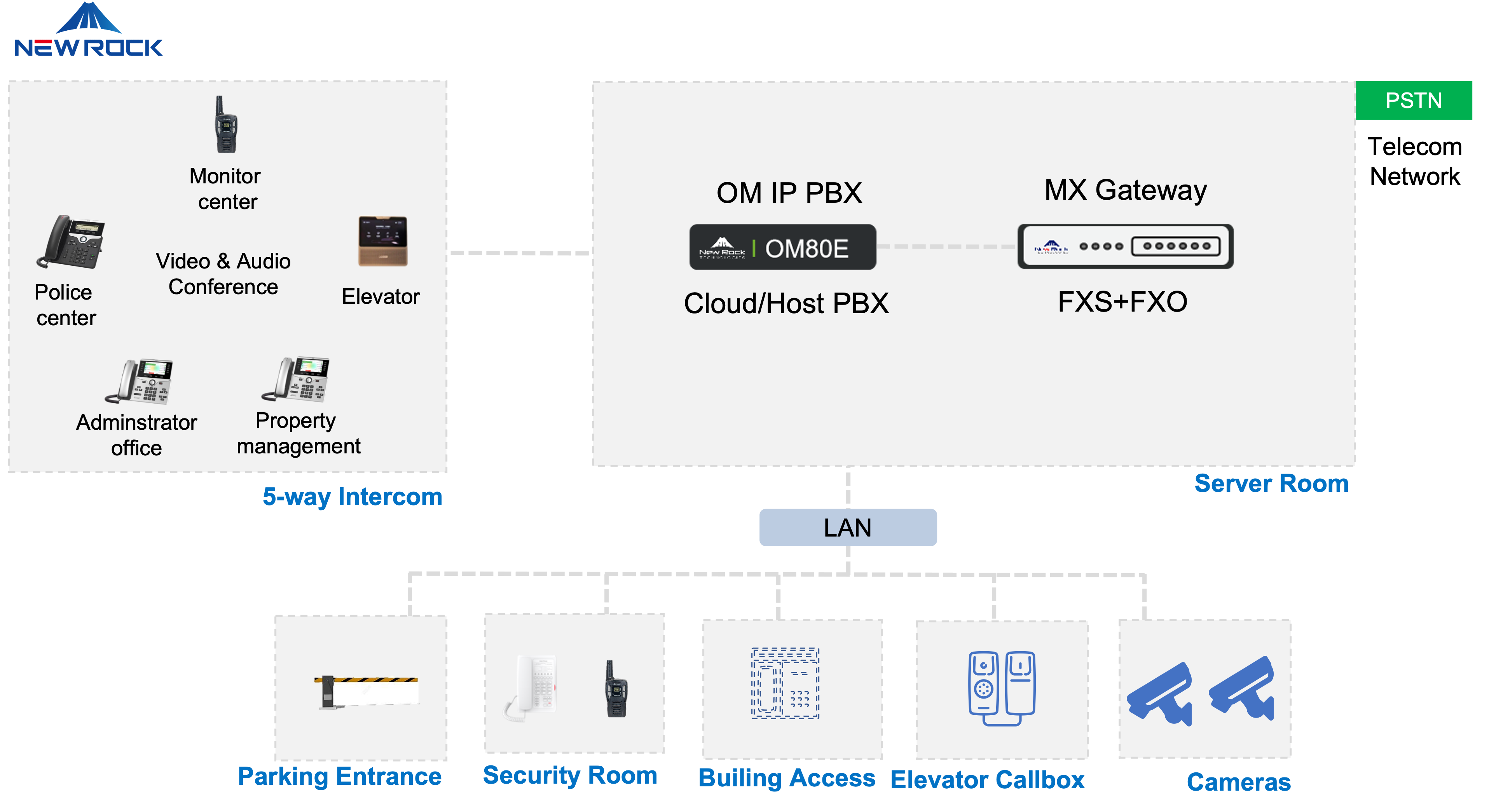 To address the real-time communication needs of multiple terminals on the campus, New Rock provides customers with an efficient and easy-to-deploy unified communication intercom platform for the campus. The VoIP-based solution supports connecting with multiple terminals supporting standard SIP protocols, and carrier-grade reliability guarantees high-definition voice call quality, and a simple system architecture, that enables five-party voice calls.
