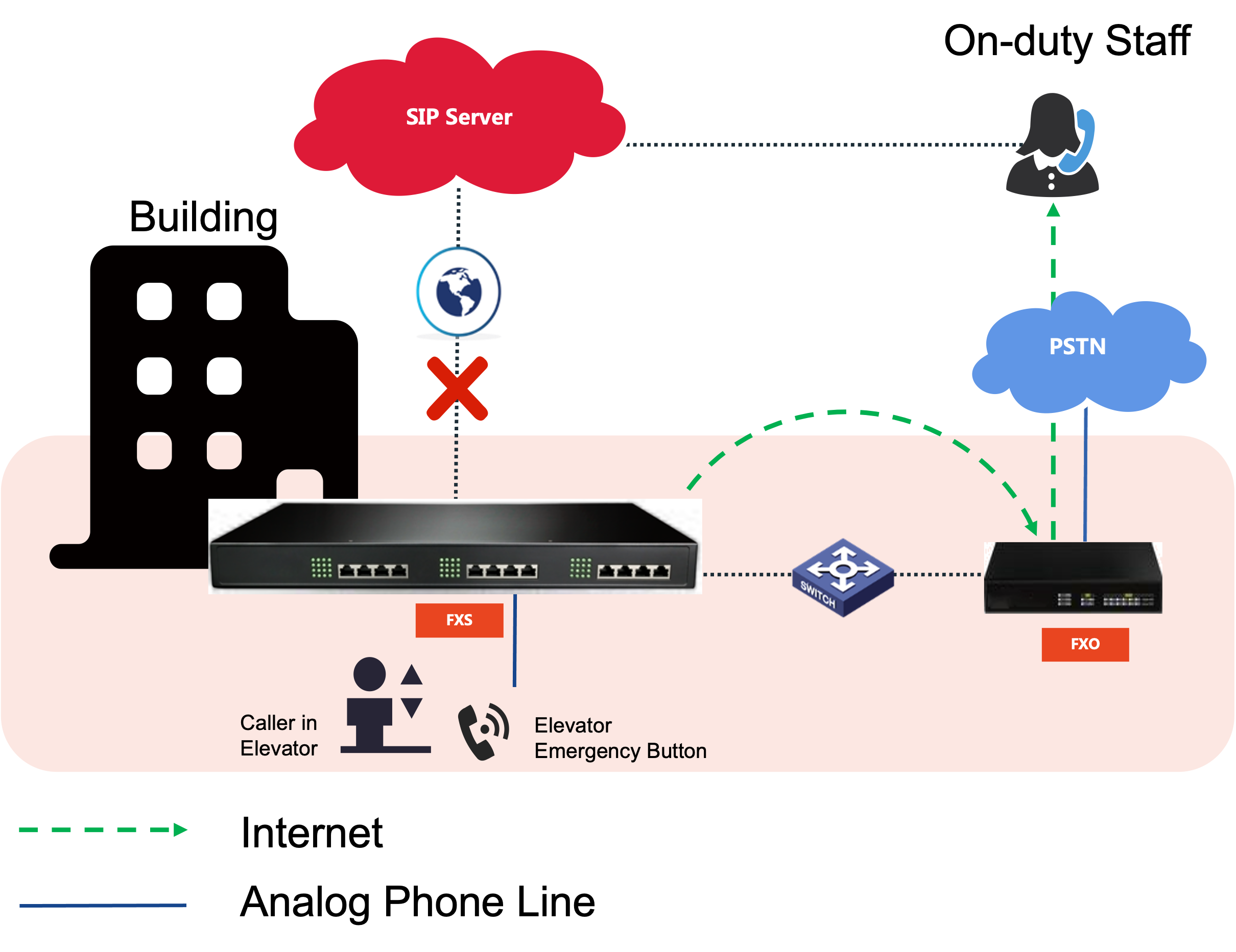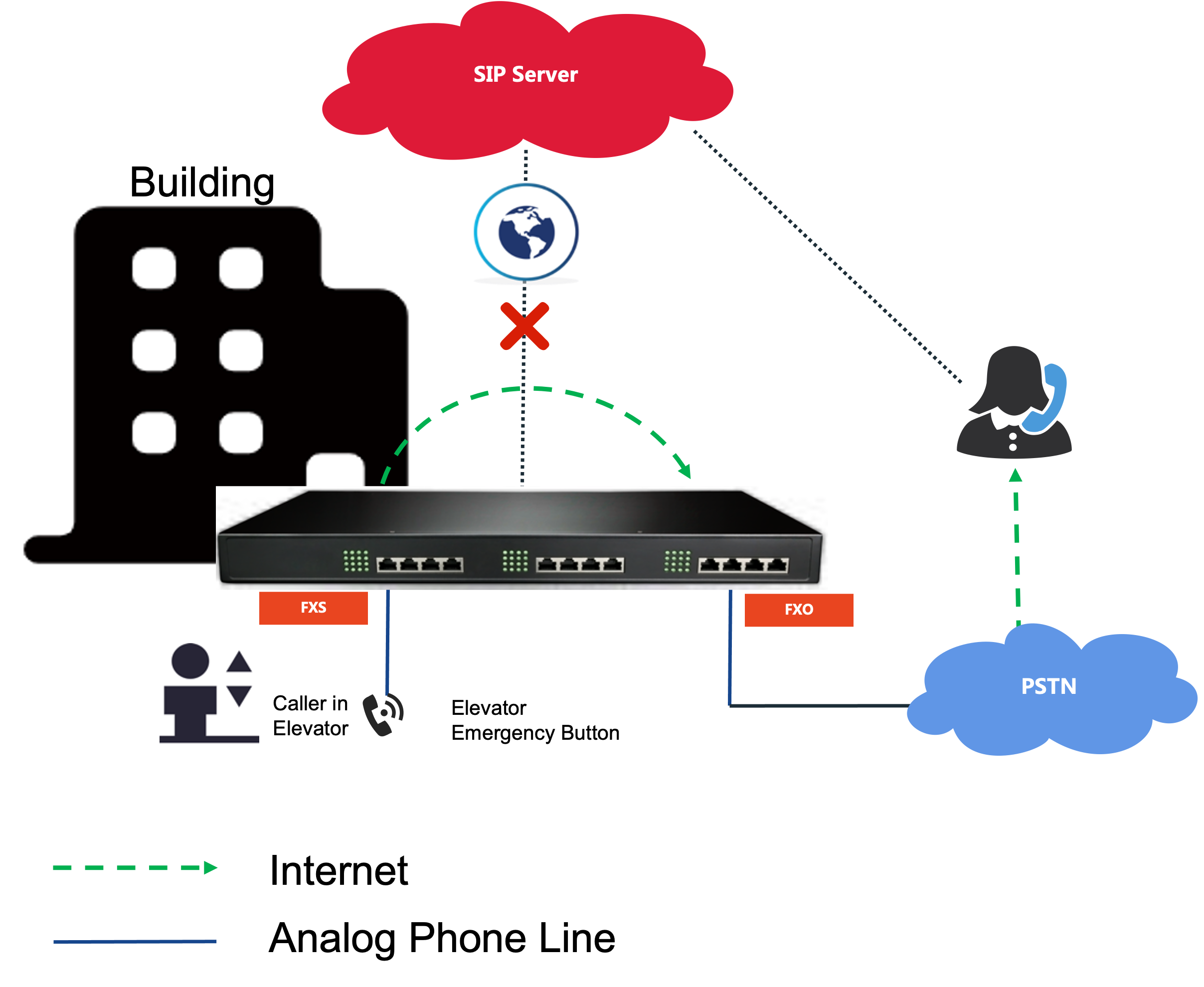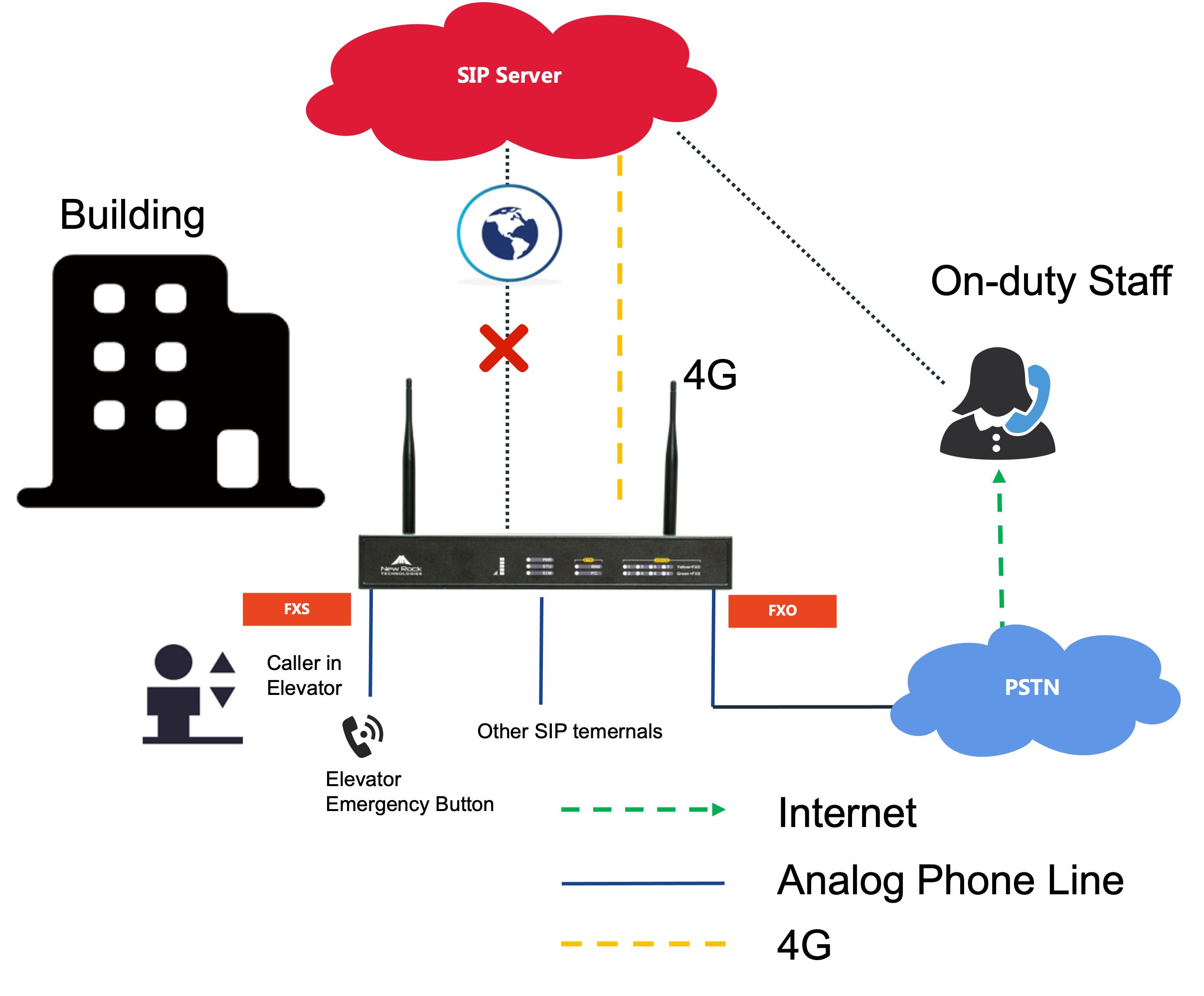 We all afraid being trapped int the elevator, normally, the emergency button will act as an analog terminals for emergency calls in the building elevator. New Rock FXO port gateways provide failover function and got your back, check 3 different ways for emergency failover.