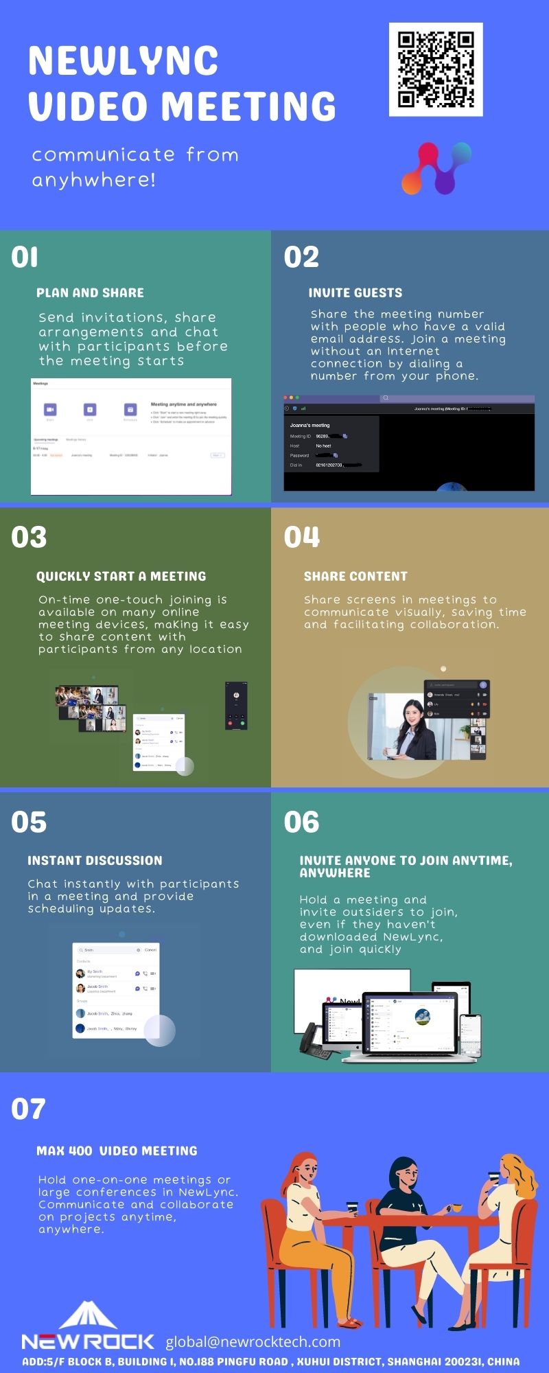 Hold one-on-one meetings or large conferences in NewLync. Communicate and collaborate on projects anytime, anywhere.