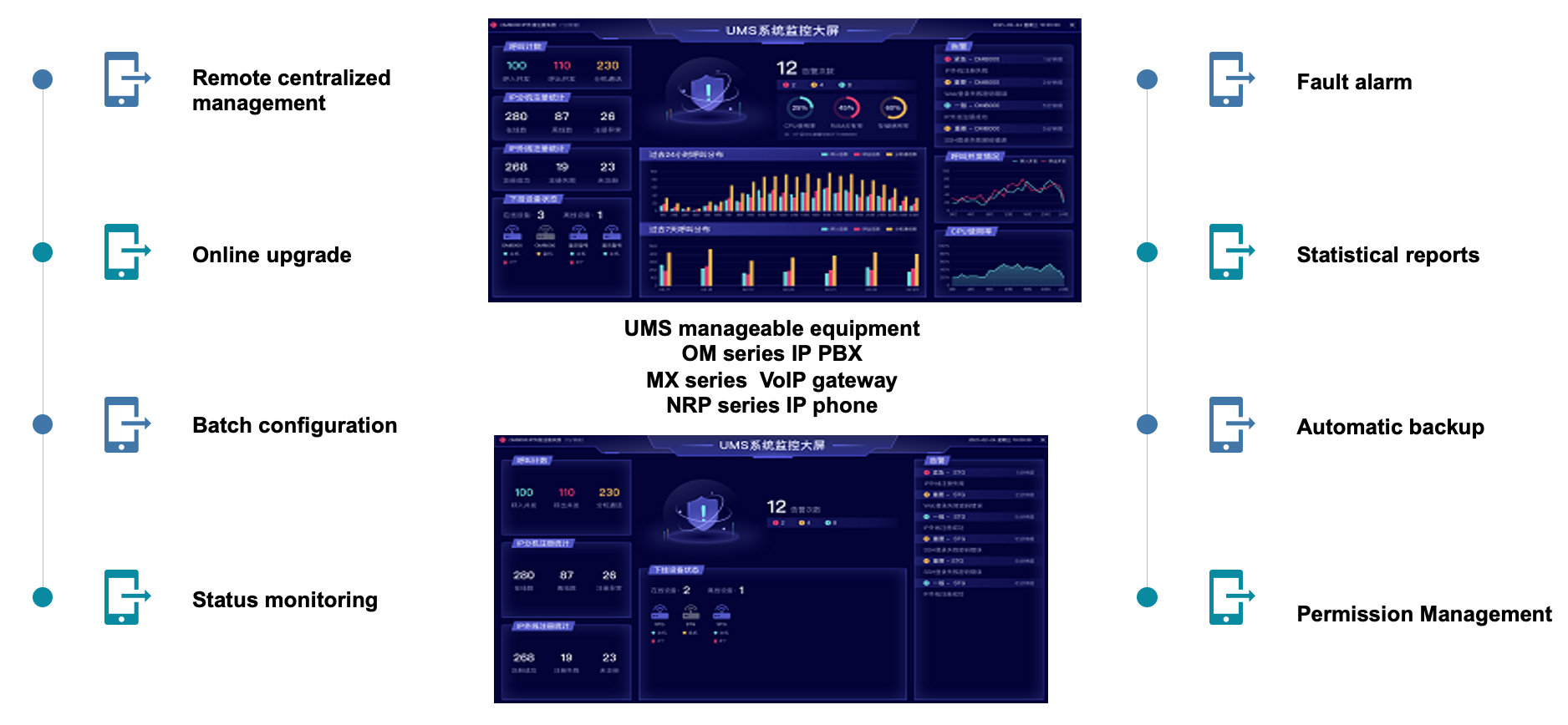 New Rock UMS is used for unified management and remote operation and maintenance of New Rock OM series IP-PBX and MX series VoIP gateways, supporting monitoring device operation status, batch distribution of device configuration files, and upgrading device software, effectively helping various operators, large and medium-sized integration projects and authorized distributors to realize smart and simple device management and reduce operation and maintenance costs.