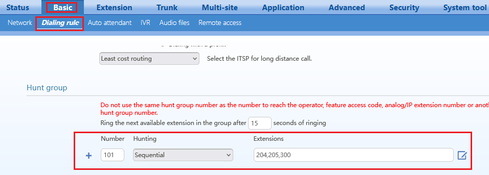 Users need to allocate multiple extensions to a hunt group of extensions, then hunt group method should be sequential so that when a caller dials the hunt group number, the extensions in the group will ring at the same time.To configure on OM , go to Basic > Dialing Rule, then create a hunt group number and select Sequential as hunting method and allocate multiple extensions to the hunt group.