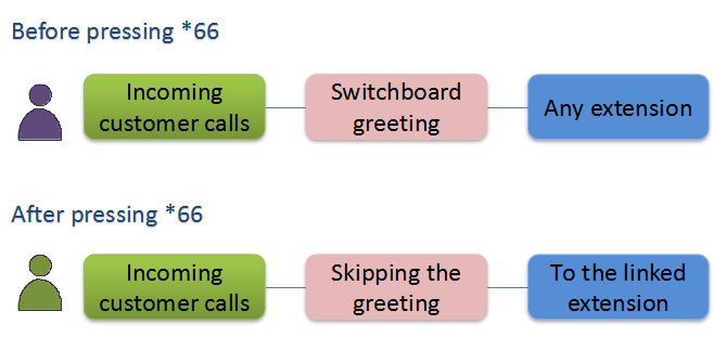 When answering a phone call on your extension, you link the caller’s phone number to your extension number by pressing *66. When the same caller makes inbound calls, switchboard greeting will be skipped, and his/her calls will be directly patched through to your extension. This provides the caller with “exclusive VIP services”.